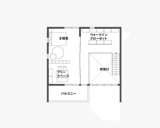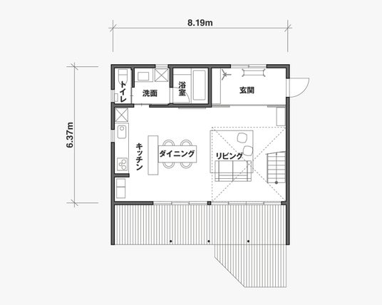 4間半×4間半(8.19m×8.19m)の今すぐ暮らし始めても違和感のない、等身大のモデルハウスです。無駄を省いたシンプルな間取り、8帖の大きな吹き抜け、ゆとりある玄関土間スペース、壁に沿わせたキッチン。また、リビングつづきの大きなウッドデッキなど、コンパクトながらも広々と余白のある空間となっています。