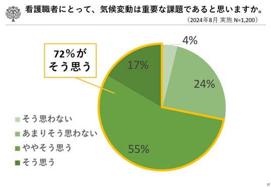 - 多くの看護職者は、気候変動は重要な課題であると回答した(72%)