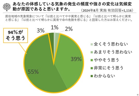 - 異常気象を認識している者の内、ほとんどの者(94%)は、気候変動が原因であると回答している