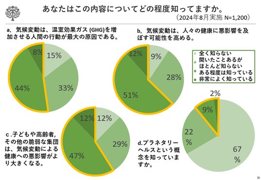 - 多くの看護職者は気候変動と健康影響に関する正確な知識を有しておらず(全問正答率42%)、「プラネタリーヘルス」という言葉も浸透していない(11.2%)