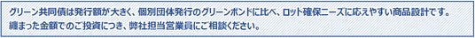 グリーン共同債への投資は地元の環境改善に貢献します。昨年度の初回債、第2回債ともに100件超の法人投資家にご参加いただき、大変好評を博しました。特に参加団体の地元投資家、とりわけ地元団体が個別SDGs債を発行していないエリアの投資家の動意が活発でした。地元の環境改善に資する投資として、今年度も多数の投資家様のご参加をお待ちしております。。