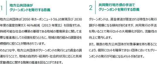 昨年度に続き3回目のグリーンボンド発行となる本債券の調達資金は、SDGsの実現に向けて、二酸化炭素(CO2)排出量を削減する緩和策や気候変動による自然災害の影響を軽減・回避する適応策に活用されます。なお、グリーン共同債は通常の共同債と同様に、共同で発行する団体が連帯債務を負う方式により発行します。
