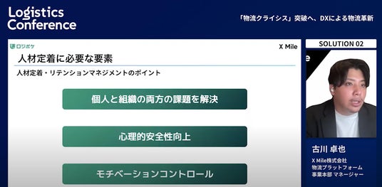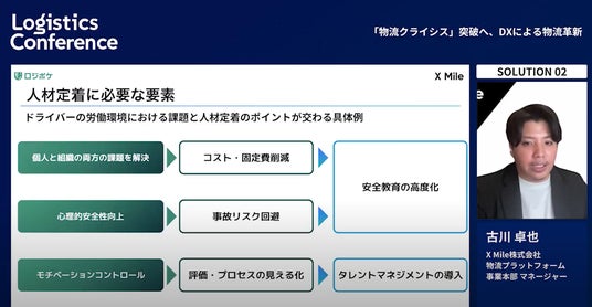 物流プラットフォーム事業本部 マネージャーの古川が登壇し「2024年問題の現状や、採用後定着率を上げる方法」などについて解説しました。
