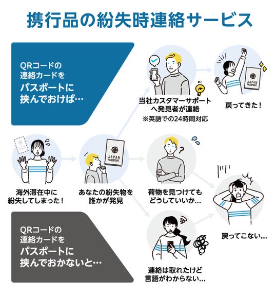 - 万が一紛失した際、落とし物の拾得者は連絡カードに記載されたQRコードを読み取ることで「貴重品発見サポート」の拾得者専用画面にアクセスでき、無料IP電話及びチャットにてビジョンの多言語対応コールセンターへ連絡