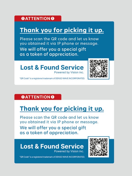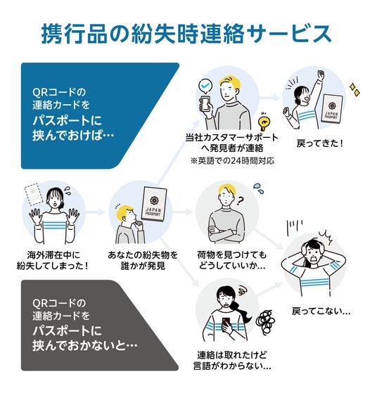 利用者が海外でパスポートや財布などの貴重品を紛失した際、発見者は紛失品に同封されたQRコード(*1)を読み取ることで、ビジョン社が運営する多言語対応のコンタクトセンターに匿名で連絡することが可能です。