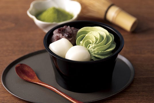 宇治抹茶を使用した和風パフェ。スポンジに宇治抹茶ムースを重ね、さらに宇治抹茶ホイップ、もちもち白玉、粒あんをトッピングしました。