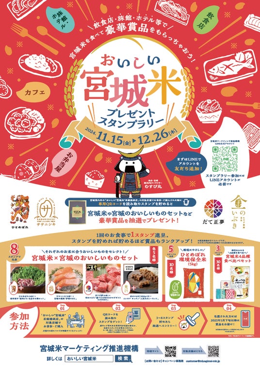 宮城米マーケティング推進機構(会長:宮城県知事 村井 嘉浩)では、良質でおいしい宮城米を用いた米飯を提供する全国の飲食店・ホテル・旅館等を「おいしい“宮城米”米飯提供店」(以下、「提供店」)として指定しています。このたび、全国の提供店において、11月15日(金)より「おいしい“宮城米”プレゼントスタンプラリー」を開催します。