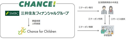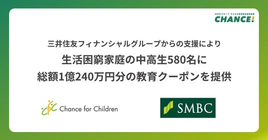 公益社団法人チャンス・フォー・チルドレン(東京都墨田区、代表者:今井悠介・奥野慧、以下「CFC」)は、株式会社三井住友フィナンシャルグループ(東京都千代田区、執行役社長グループ CEO:中島達、以下グループを総称して「SMBCグループ」)の資金を原資に、生活困窮家庭の中学2・3年生および高校2・3年生580名に対して、総額1億240万円分の「SMBCグループ・スタディクーポン」を提供いたしました。スタディクーポンは、提携する学習塾や習い事等の費用として利用可能です。