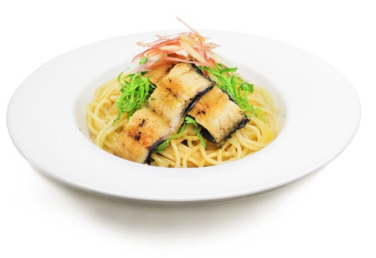 肉厚で旨味のある宮崎県 新富町産の「白うなぎ」を使用したパスタです。八方だしに生姜をあわせ、「白うなぎ」にまぶして飾り付けました。ほ大葉とみょうがが程良くアクセントに効いた、素材の旨味をご堪能いただけるパスタです。