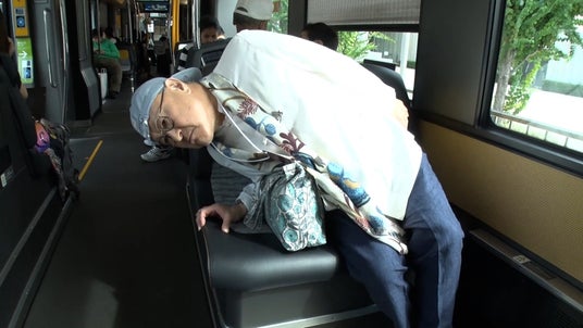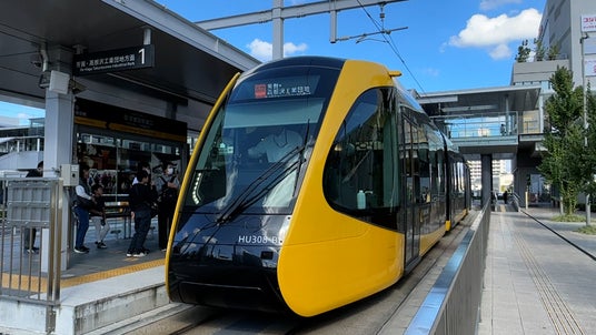 停留所に登場したのは、近未来感を醸し出すボディーラインのHU300形の車両。カラーリングには雷の稲光をイメージした黄色が採用されており、角野も「黒に黄色でシャープですね」とほれぼれ。革張りの豪華な座席に、「路面電車でこんなの初めてや」と興奮する。モーター音にも耳を傾け、鉄ちゃんモードも発動!