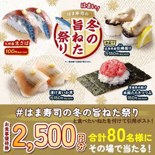 株式会社はま寿司(代表取締役社長:町野 岳 本社:東京都港区)が展開する100円寿司チェーン「はま寿司」は、11月19日(火)より、「はま寿司の冬の旨ねた祭り」を全国の店舗で開催します。