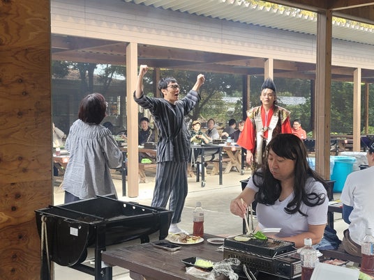 摩訶不思議珍道中一行がイバライド内の野外料理場で豚肉や野菜焼きを堪能していると、そこに代表を探す女性とミステリーツアーの一行が合流。女性は武将様とゴエ爺に代表がいないか聞くも残念ながら見つからず、仕方なくここでランチをとることに。両ツアーの和気あいあいとした時間もつかの間、なんとゴエ爺の食事に何者かによって毒が盛られ、苦しみだすゴエ爺。そこで解毒係がすぐさま対処。回復の儀で太鼓係と拍子木係に合わせてゴエ爺は感謝の口上を述べました。すると、「仕上がってますね(笑)」と他人事だったRGの食事にもまさかの毒が。RGも少し残っていた解毒剤をわけてもらい、なんとか命拾いしました。