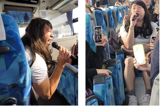 RGのバスでは、「RGあるあるワールドツアーin九州」で声がカスカスになったRGが「ちょうどいい歌がある」と、中村あゆみ『翼の折れたエンジェル』で喉慣らし。すると、「Thirteen 代表と出会い」「もし俺が代表だったら 記者を近づけやしないのに」と自然と歌ってしまい、「私たちの歌になってる!」とビックリ。その後は『恋におちて -Fall in love-』(小林明子)、『もしかして PART II』(小林幸子・美樹克彦)、『やっぱ好きやねん』(やしき たかじん)など、あるあるそっちのけで代表への想いを熱唱。途中、カラオケPVに出てきた男女の切ない顛末を自分と代表に重ねて「代表!」と絶叫してしまう場面も。乗客も、次第にかわいく見えてきた“代表を探す女性”にどんどん肩入れ。代表の情報をネットで調べたりと、なかなか代表に会えない女性に同情しているうちに、あるあるを歌わないまま、最初の目的地に到着しました。