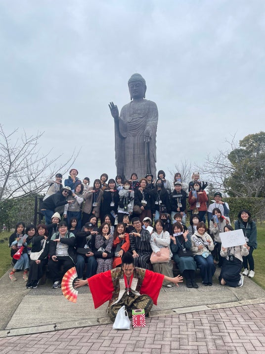 鎌倉時代に誕生した浄土真宗の東本願寺派本山東本願寺によって昭和に着工し平成に完成した牛久大仏の前で令和に記念撮影する戦国時代の武将様とその一行