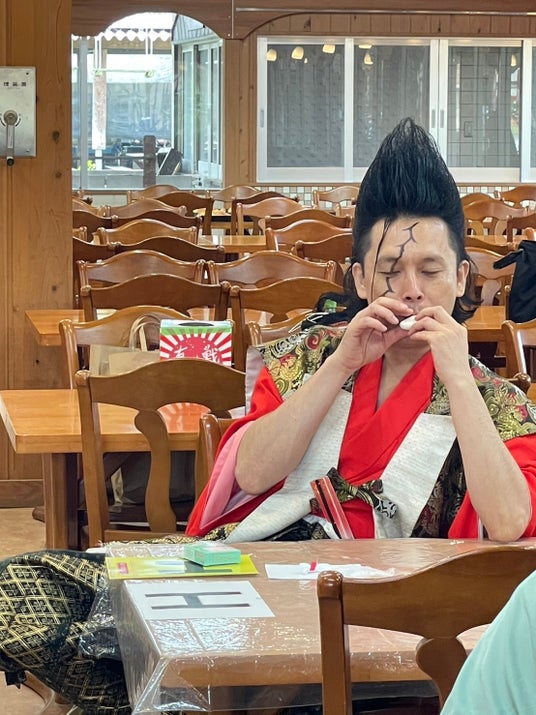 摩訶不思議珍道中の大型籠はまず守谷サービスエリアへ。ここで、段差係が高齢のゴエ爺に段差を知らせるのが遅く、段差に気付いたゴエ爺が恐怖でワナワナしてしまう珍事が発生。武将様は段差係を責めるも、恩情により事なきを得ました。そして、護衛係が武将様の周囲を守り固めながらエリア内を満喫。護衛係のおかげで敵に襲われることなく、次なる目的地「こもれび森のイバライド」に到着できました。園内ではオカリナの絵付けを体験。ゴエ爺は特徴の眼鏡を描いたオカリナのデザイン。武将様は絵付けをせずに参加者たちにリクエストを募って優しくオカリナの曲を奏でます。黄色く染まった銀杏並木では、2人の写絵を撮影するため、撮影係、化粧係、美白係などが総動員。さらに、園内で謎解きの手がかりとなる巻物を発見。謎解きに頭を悩ませつつ多くの任務を遂行する盛りだくさんの珍道中を繰り広げつつ、やっと昼食の時間が訪れます。