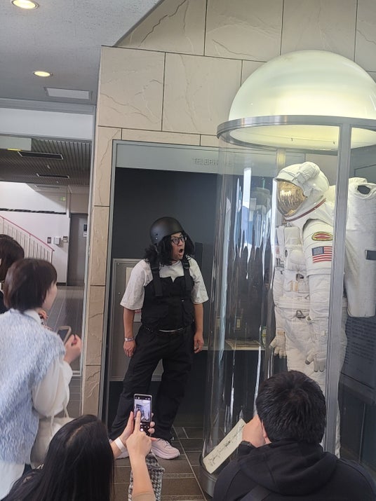 宇宙服を購入した後にはこの前で宇宙から帰還する宇宙飛行士のような動画を撮影。仕上がりはXにて御確認を