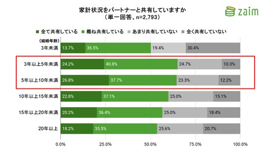 夫婦でお金について話し合うには、日々の支出、収入、貯蓄、投資などの家計状況をふたりが把握することが必要です。家計簿アプリ「Zaim」のユーザー計2,884名への調査において、結婚年数別に家計状況の共有度合いを見ると、結婚年数「3年以上5年未満」「5年以上10年未満」では、「全て共有している」「概ね共有している」を合わせた約65%が「共有している」と回答しました。