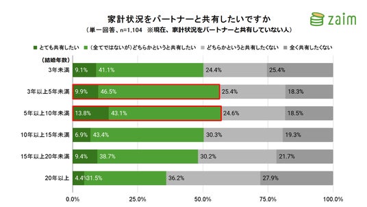 家計状況をパートナーと共有していない人に「共有したいか」を尋ねたところ、結婚「3年以上5年未満」「5年以上10年未満」においては6割近くが共有を望んでいることがわかりました。結婚から数年経過すると住宅購入や出産・子育てなどのライフイベントを迎えることも多く、まとまったお金が必要になることから、パートナーと一緒に家計管理を行う必要性を感じる人が増えるためと考えられます。