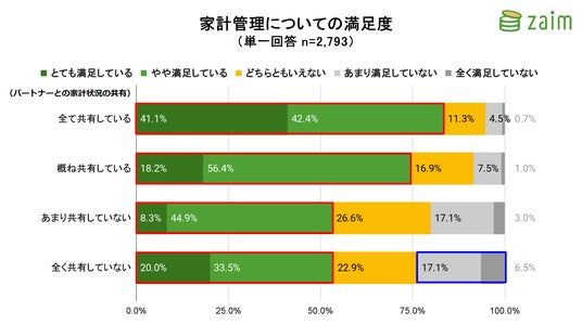 夫婦間で家計状況を共有することによる影響を見るため「家計管理の満足度」を共有度合いで比較したところ、「全て共有している」人においては「とても満足している」と回答した割合が41.1%と最も高くなりました。「とても満足している」「やや満足している」を合わせた家計管理への満足度は「全て共有している」83.5% >「概ね共有している」74.6% >「全く共有していない」53.5% >「あまり共有していない」53.2%の順となりました。