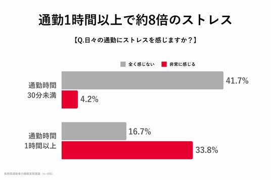 通勤1時間以上で「ストレスを非常に感じる」8倍