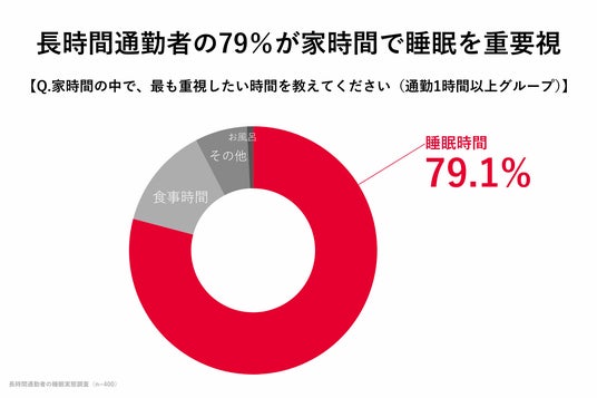 長時間通勤者の多くが、家で過ごす時間の中で「睡眠」を最も重視していることも明らかになりました。通勤1時間以上グループの79%が、家時間の中で睡眠を最も大切にしたいと回答しており、睡眠の質や時間の確保がいかに重要な課題として認識されているかが浮き彫りになっています。