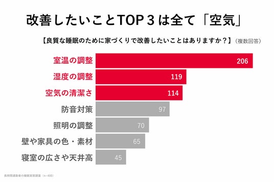 さらに、良質な睡眠を得るために改善したい要素についても調査したところ、「室温」「湿度」「空気の清潔さ」が上位に挙げられました。これらはすべて「空気」に関連しており、空調管理や空気清浄などが、快適な睡眠環境を作るために重要であることが示されています。特に、睡眠環境を整えるための温度・湿度管理や空気の質の向上が、長時間通勤者にとって求められている改善ポイントであることが明らかです。
