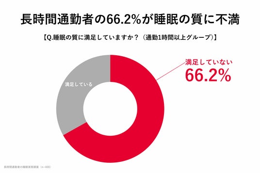 長時間通勤者の間では、睡眠の質に対する不満も高いことが確認されました。通勤1時間以上のグループの66.2%が「睡眠の質に満足していない」と回答しており、疲労の蓄積や睡眠の質の低下が生活の質に悪影響を及ぼしていると考えられます。睡眠を重要視する一方で、日々の睡眠に不満を持っている現状が浮かび上がりました。