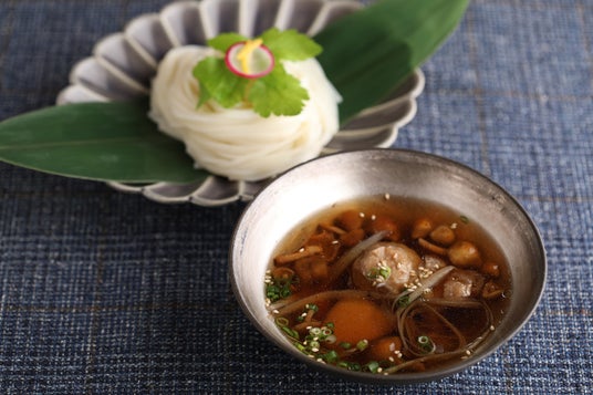 ◇斎藤製麺/稲庭うどん醍醐味 軍鶏スープつけ麺(1人前 1,280円、2人前 2,360円)昔ながらの伝統手法と『完全手造り』を守り、特有のコシや喉越しの違いを感じる横手名産の稲庭うどん。軍鶏の旨みが溶け込んだ温かいスープと共にお楽しみください。