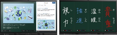 「ホワイトボード機能」は手書き文字を自動でテキストに変換できるため板書をきれいに残すことができます。また、書き込んだ文字をインターネットで検索でき、ホワイトボード画面と検索画面を2画面で同時に表示※2できます。さらに、ホワイトボード画面は最大4画面に分割でき、それぞれの画面で同時に書きこみや削除ができるため、グループワークや回答の同時記入などにも応用でき、使い方の幅が広がります。