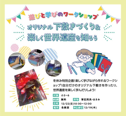 株式会社 学研ホールディングス(東京・品川/代表取締役社長:宮原博昭)のグループ会社、株式会社 学研スタディエ(さいたま市/代表取締役社長:亀谷眞宏)が展開する、宮城県の総合進学塾 あすなろ学院では、令和6年12月22日(日)に「遊びと学びのワークショップ オリジナル下敷きづくり&楽しく世界遺産を知ろう」を開催いたします。