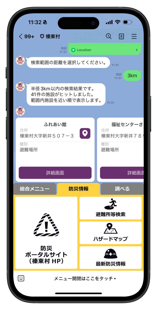 送ることで、近くに避難所を検索することができます。また、天候状況等、最新の防災情報を得ることもできます。