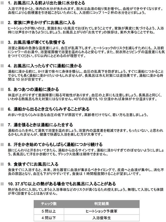 お風呂ドクター・早坂先生監修 ヒートショック診断テスト 5個以上チェックでヒートショック予備軍