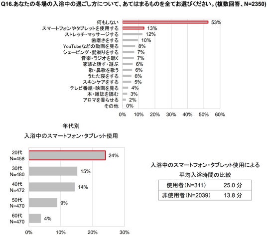 「スマートフォンやタブレットを使用する」の回答者を年代別で見ると、若い世代ほど高い結果でした。平均入浴時間を比較すると、使用者は25.0分、非使用者は13.8分でした。