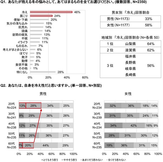 全国の2,350名に冬の時期に多い身体の不調を聞きました。その結果、最も多い回答は「冷え(46%)」、続いて「肩こり(24%)」でした。「冷え」に悩む割合を男女別で見ると、男性3割、女性6割でした。地域別では、山梨(64%)が最も多く、続いて滋賀(62%)、そして福井、長野、岐阜、長崎(56%)が同率3位でした。
