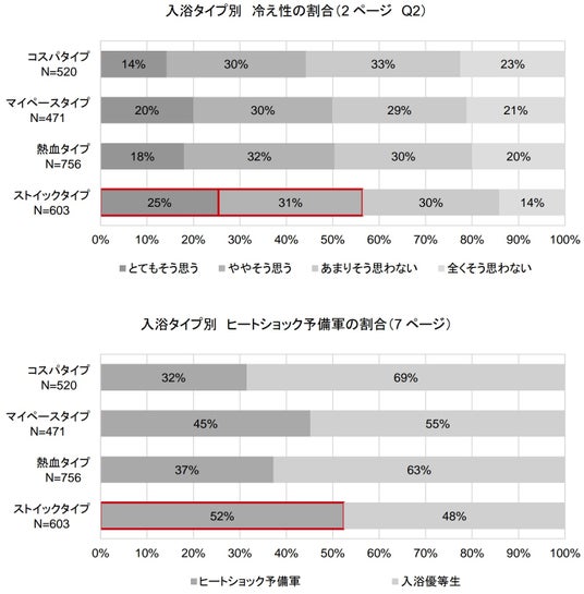 入浴タイプ別に、冷え性とヒートショック予備軍の割合を比較しました。その結果、ストイックタイプは、冷え性が半数以上(「とてもそう思う(25%)」「ややそう思う(31%)」の合計56%)、ヒートショック予備軍についても半数以上(52%)を占めました。