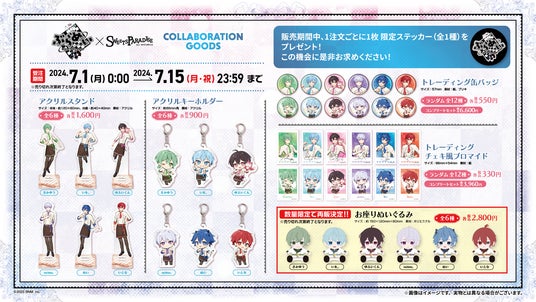 コラボカフェ限定の「アクリルスタンド」「トレーディング缶バッジ」のほか、描き下ろしミニキャラの「チェキ風ランダムブロマイド」「アクリルキーホルダー」など様々な新作グッズが公式オンラインストアでお買い求めいただけます!!