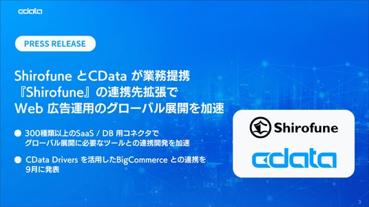 2024年11月20日、CData Software Japan 合同会社(本社:アメリカノースカロライナ州、日本オフィス:宮城県仙台市、代表社員 職務執行者:疋田 圭介、以下CData)は、株式会社Shirofune(本社:東京都中央区、代表:菊池満長)と、同社が開発・提供する広告運用自動化ツール『Shirofune』(シロフネ)のデータ連携技術において業務提携を開始しました。『CData Drivers』をShirofune に組み込むことで、Shirofune はBigCommerce などのグローバルなSaaS との連携を迅速に実現できます。