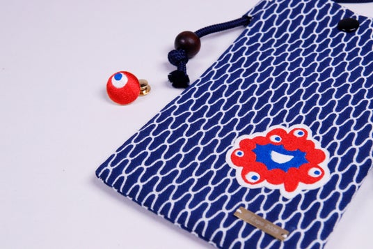 綿の手ぬぐい生地に江戸刺繍でミャクミャクを手刺繍したサコッシュは、刺繡部分が絹糸製品ならではの光沢を放ち、木綿糸を用いる製品にはない質感があります。