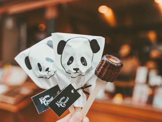 クラマエカヌレを木製スティックに刺して、かわいいエキュート上野限定のパンダパッケージで包みました。食べ歩きやちょっとしたお土産にぴったりで、手を汚さずに楽しめます。