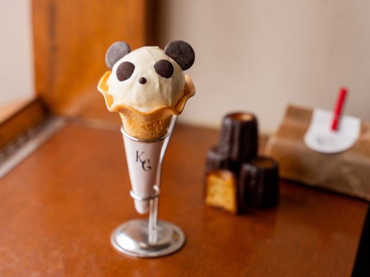 蔵前本店で大人気の「カヌレ&ソフトクリーム」がエキュート上野限定バージョンで登場します。味わい濃厚なソフトクリームに、パンダの飾り付けをチョコチップで仕上げました。中にはざく切りにしたカヌレが入っています。