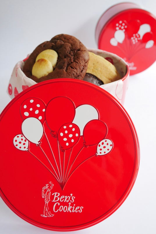 赤いギフト缶 バルーンデザイン 1缶 1,800円(スモールギフト缶・クッキー4枚入)、3,600円(ミディアムギフト缶・クッキー8枚入)/Ben’s Cookies(ベンズクッキーズ)