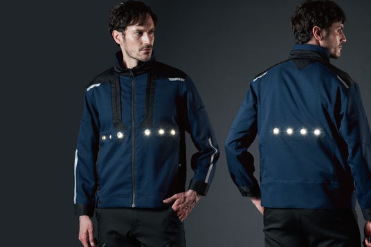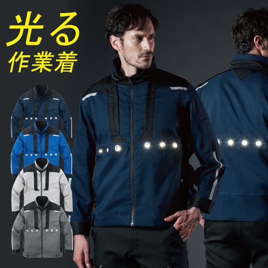 高視認性デザイン:反射素材やLEDライトが作業着に組み込まれており、車のライトや他の光源に反応して輝き、夜間でも高い視認性を実現。