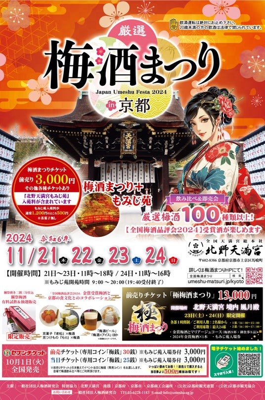 本日11月21日(木)から4日間、京都・北野天満宮で「厳選梅酒まつりin京都2024」が開催。最新の受賞梅酒が飲み比べブースなどでお楽しみいただけます。