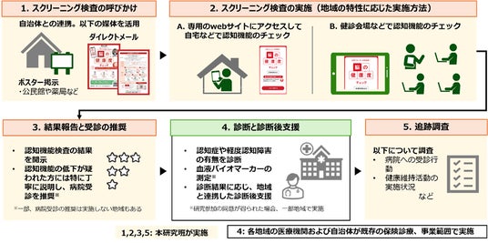 研究班は、全国41の自治体と協力し、計10,000名以上の高齢者の方にご参加いただいて各自治体の特性に合わせた様々な方法でスクリーニング検査を実施します。また、詳細な検査が必要と判断された方には病院での受診を促します。さらに数カ月後に追跡調査を行い、実際に病院を受診されたかどうかや、受診後の予防に向けた活動あるいは、地域包括支援センターや認知症カフェ等の地域資源との連携を含む診断後支援(本人・家族支援)の実態を調査します(図1)。これにより、日本のそれぞれの地域において適切なスクリーニング検査の実施方法、住民への呼びかけ方法を検討するとともに医療機関の受診、予防に向けた活動を妨げている原因を明らかにします。