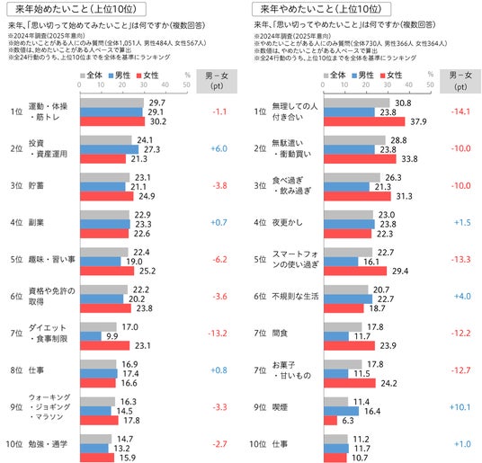 【2025年に始めたい/やめたいこと】来年始めたいのは「運動・体操・筋トレ」「投資・資産運用」、やめたいのは「無理しての人付き合い」
