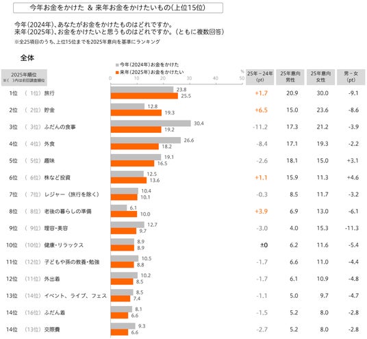 【2025年にお金をかけたいこと】来年お金をかけたいことは、1位「旅行」、2位「貯金」、3位「ふだんの食事」
