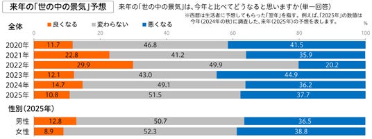 生活者が予想する来年の景況感や生活気分、行動意欲などを時系列で比較する調査。
