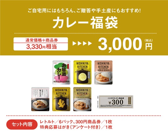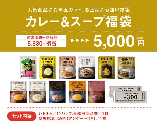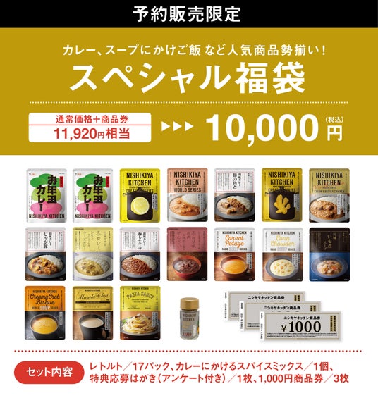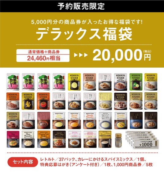 「世界の料理を『カンタン』に。」をコンセプトに掲げ、レトルトカレーを中心に販売するレトルト食品専門店NISHIKIYA KITCHEN(ニシキヤキッチン)(株式会社にしき食品 本社:宮城県岩沼市、代表取締役:菊池洋)は、公式オンラインショップにて、2025年の福袋の最終予約受付を2024年11月23日(土)に開始します。2024年11月20日(水)に公式オンラインショップで開始した1次予約では、発売開始1分でプレミアム福袋が完売、18分でニューイヤー福袋が完売となりました。最終予約でも1次予約と同数を受け付けます。2025年福袋の販売は、今回で最終となり、なくなり次第終了とさせていただきますので予めご了承ください。2025年の福袋は、選んでいただけるよう2種類ご用意しました。どちらにも、福袋限定の「オリジナルランチバッグ」がついています。