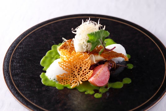 魚料理の『長崎県産キジハタのポワレと黒米のリゾット キジハタ出汁の春菊ソース』は、サクサクとした食感の自然薯のフリットや、丹波ラディッシュなどの付け合わせも存分にお楽しみいただけます。シェフが厳選した長崎県産のキジハタの旨味を、ポワレやソースで余すことなくご堪能ください。