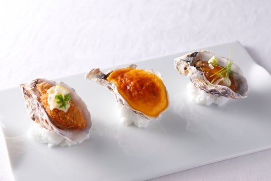 前菜の『福岡県糸島産“ミルク牡蠣” 食べくらべ』では、グラタン、フライ、土佐酢のカクテルの3種類の味わいで旬の牡蠣を贅沢にお楽しみいただけます。